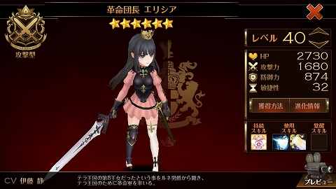 始めに実装されたのは、革命団のリーダー「エリシア」。全ての味方のダメージ量を50%上昇する持続スキルを所持しているので、様々な編成の鍵となれそうです。