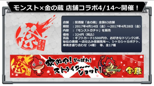 全国に63店舗ある、居酒屋の金の蔵さんとモンスターストライクがコラボします!
