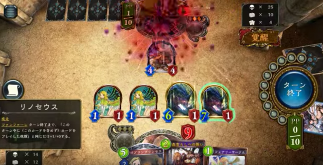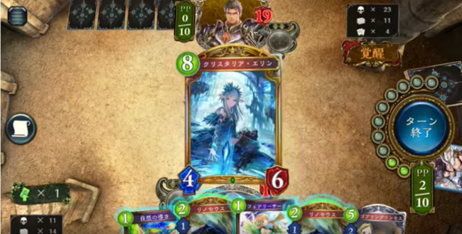 その後、戦況は膠着。「クリスタリア・エリン」で回復と盤面を睨んでいきます。手札には「リノセウス」コンボで17点確保しています。