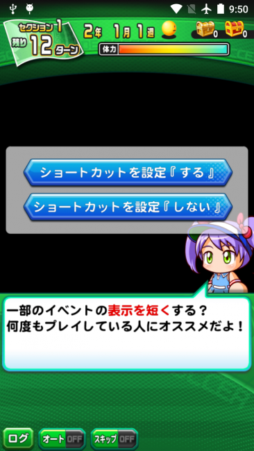 サクセスを開始するときに、「ショートカットを設定『する』」、にするとイベントの表示を短くすることができます。