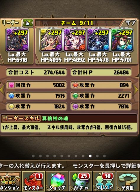 このように火力も最大900倍出すことができて、操作延長やバインドなどの対策もできていてとても強いキャラなのですが、HPがリーダースキルで強化されてないのでどうしてもHPが低くなってしまっています。
