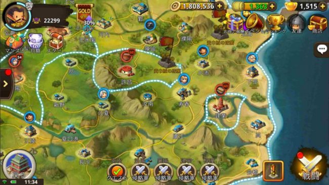 こちらが天下統一モード。三国志好きならよく知っている地名に胸が躍る。