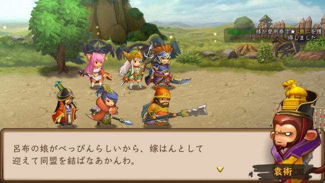 ストーリー自体の流れは、確かに三國志の流れに沿っているが、ガチャでダンスしていたり、ギャグで横文字が使われていたりとネタ寄りの作り。
