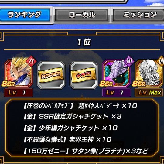 1位になると【SSR】圧巻のレベルアップ 超サイヤ人ベジータが10体貰えます・・・