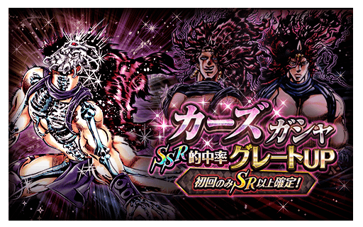 Source: 【ジョジョSS】初回のみSR以上確定!SSR的中率グレートUP!SSR的中で「カーズ」確定!「カーズガシャ」開催中!