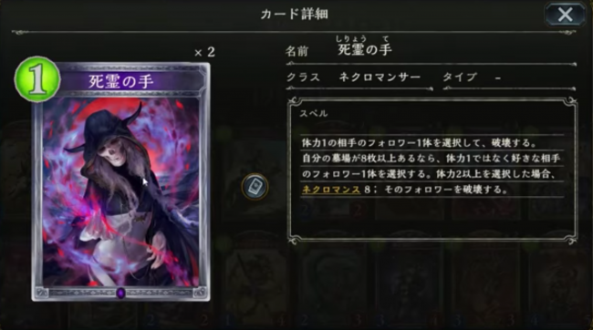 サーチするフォロワーはネクロマンサーのカードに限定されるので、調整によっては場に出すタイミングで顔を変える面白いデッキができそうです。
