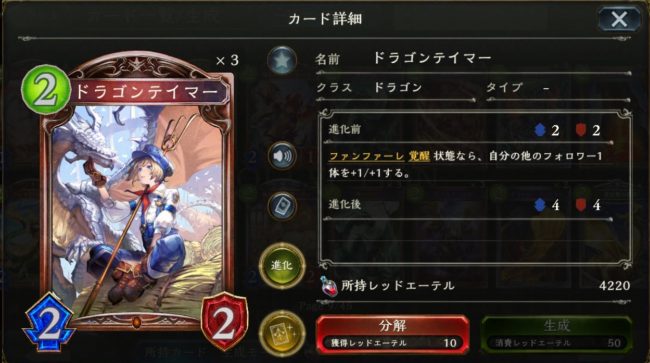 「ダークドラグーン・フォルテ」を「ドラゴンテイマー」2枚で強化!スタッツは進化込みで9/5に。