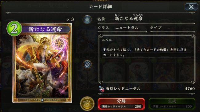 効果:コスト5以上のカードをランダムに1枚、自分のデッキから手札に加える。そのコストを-1する。