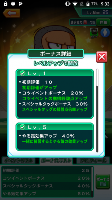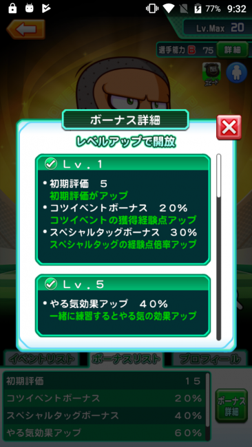 パワサカのR野々原球児のボーナス詳細です。