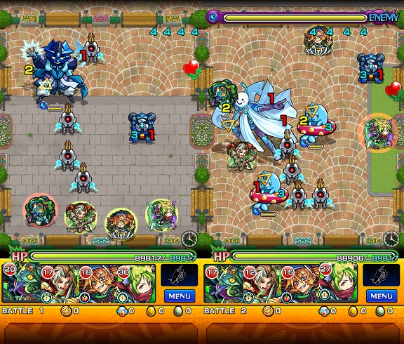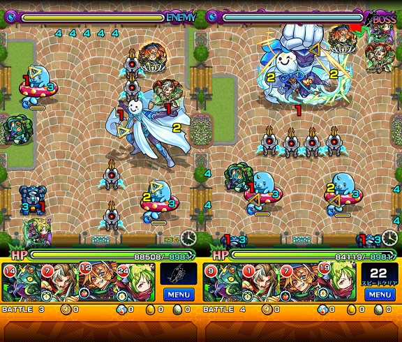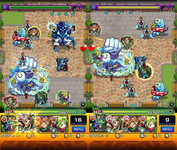 ここもキューの回復が厄介なので優先して処理しましょう。貫通タイプで一筆書きで1ターンで2体同時に倒すのが理想です。