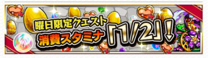 期間中は曜日限定クエスト(亀・進化素材・獣神竜)の消費スタミナが通常の1/2になります。