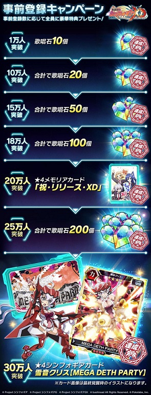 リリースを記念して事前登録30万件キャンペーン達成報酬としてインストールしていただいた方全員を対象に歌唱石200個、★4メモリアカード「祝・リリース・XD」、さらに★4シンフォギアカード「雪音クリス【MEGA DETH PARTY】」をプレゼントします。