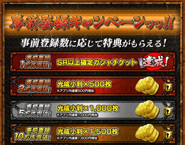 サービス開始時、事前登録件数に応じてゲーム内で役立つアイテムを、ログインユーザー全員にプレゼントされます。