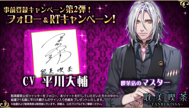 声優陣の情報公開を記念し、耽美喫茶公式ツイッターでは、Amazonギフト券と人気声優やイラストレーターのサイン入り色紙がもらえる事前登録キャンペーン第2弾を開始いたします。
